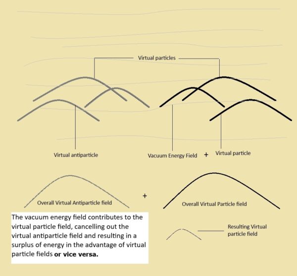 The vacuum energy field contributes to the virtual particle field, cancelling out the antiparticle field and resulting in an overall surplus of energy in the advantage of the virtual particle field. See a representation of what I am thinking, below. Vacuum Energy + Virtual Particle Field – Virtual Antiparticle Field = Remaining Particle Field. Although it could be the other way around, resulting a Remaining Antiparticle Field. This would build up and eventually lead to the creation of Real Particles.