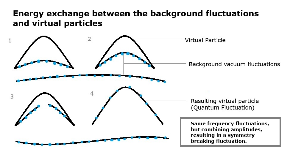 Imagine two strings: one vibrating faintly (lower amplitude), part of the background hum of the vacuum; the other louder (same frequency, but higher amplitude), a quantum fluctuation, resulting in a vibration with the same frequency but higher amplitude than both vibrations alone – a sum of the amplitudes (this is an ideal scenario, still the resulting fluctuation has a symmetry breaking frequency avoiding cancellation). As they interact, energy shifts. This imbalance breaks the symmetry between particles and antiparticles — and in some cases, the energy accumulates and the surplus becomes real.